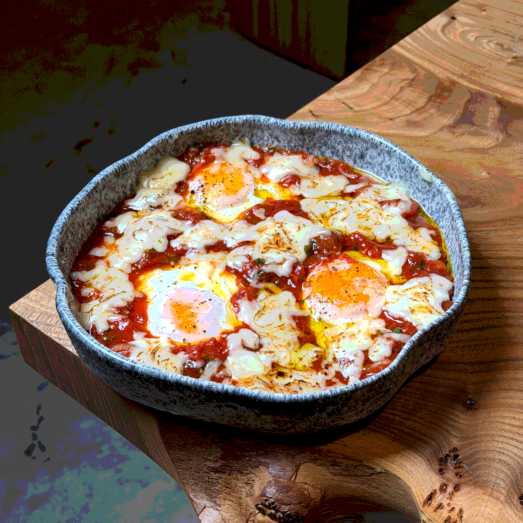 Шакшука из трех яиц с томатным соусом и моцареллой
