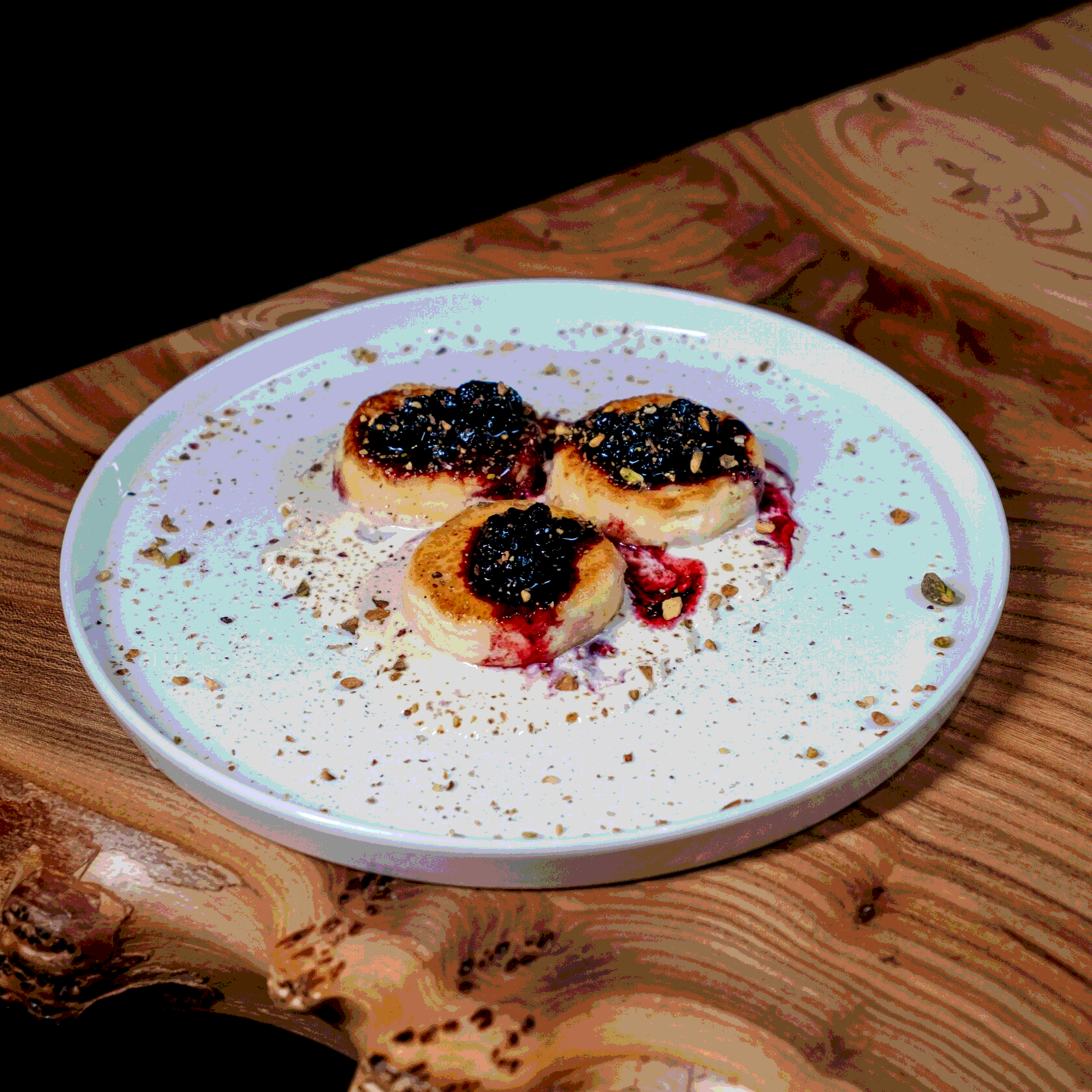 Сырники с карамельным кремом и компоте из черники