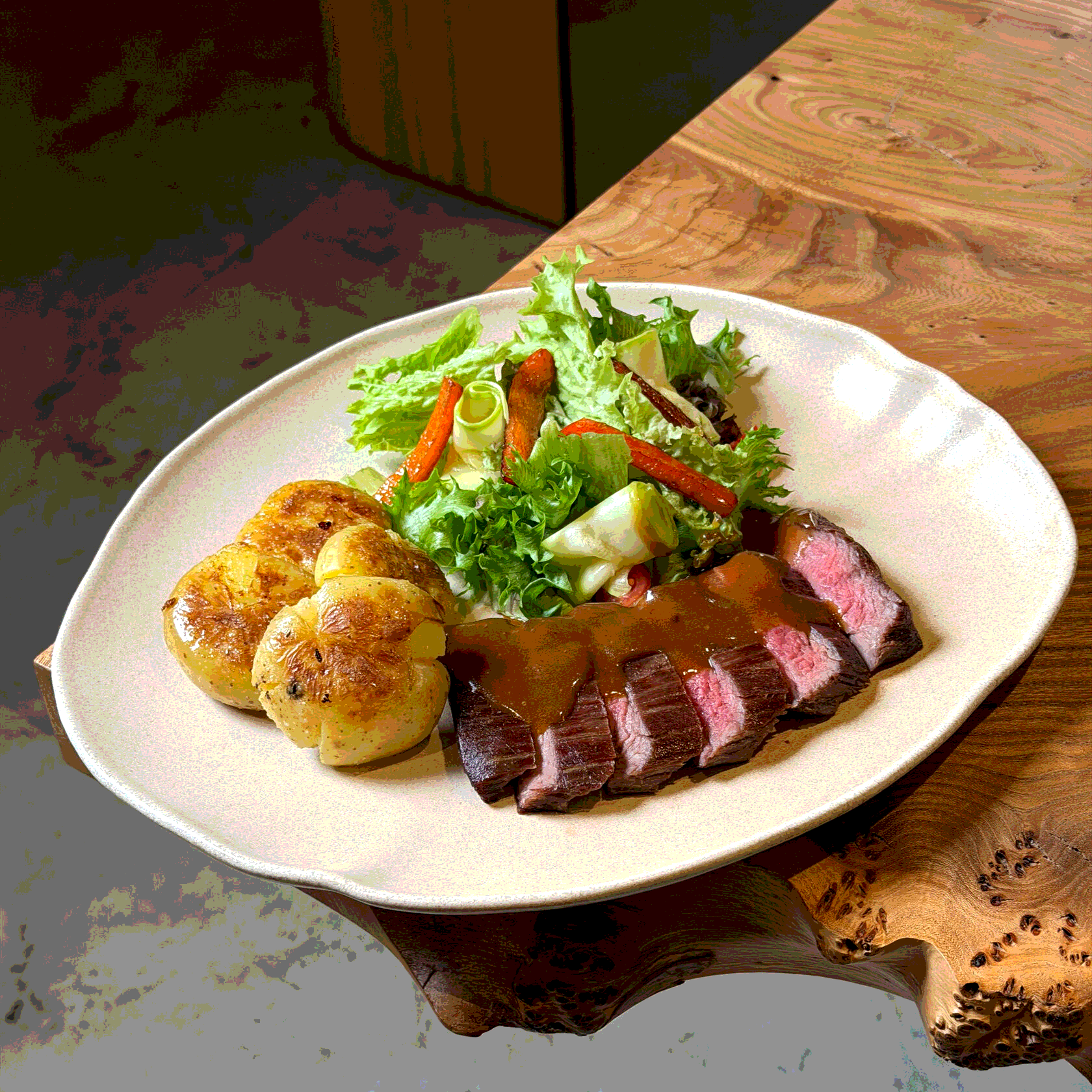 Фланк с перечным соусом, картофелем и овощным салатом