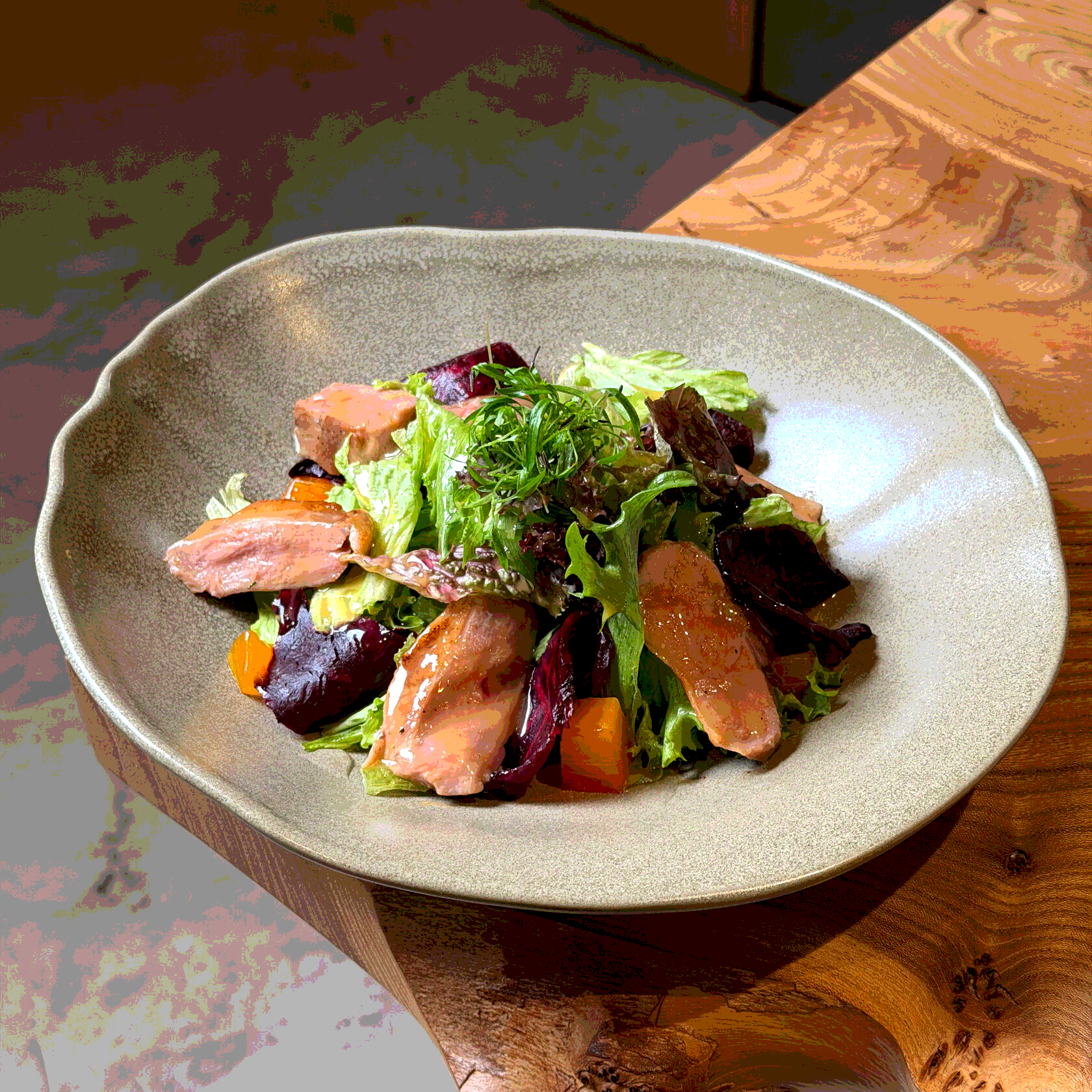 Салат с уткой, свеклой, грецким орехом и апельсиновым соусом